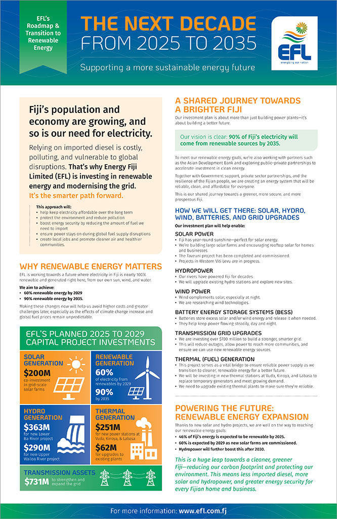 Fiji’s population and economy are growing, and so is our need for electricity. Relying on imported diesel is costly, polluting, and vulnerable to global disruptions. That’s why Energy Fiji Limited (EFL) is investing in renewable